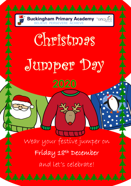 - And finally, this year we will be finishing the term by encouraging staff and pupils to wear a Christmas jumper and doing lots of fun filled activities on Friday 18th December!